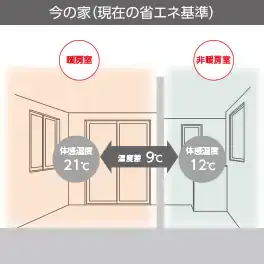 建物の断熱性能を高めると、家の中の部屋ごとの温度差が少なくなります。省エネルギー基準レベルの家とHEAT20 G2グレードの家を比較してみると、リビングとトイレの温度差が9℃に対し5℃と、なんと4℃も違いがあります。